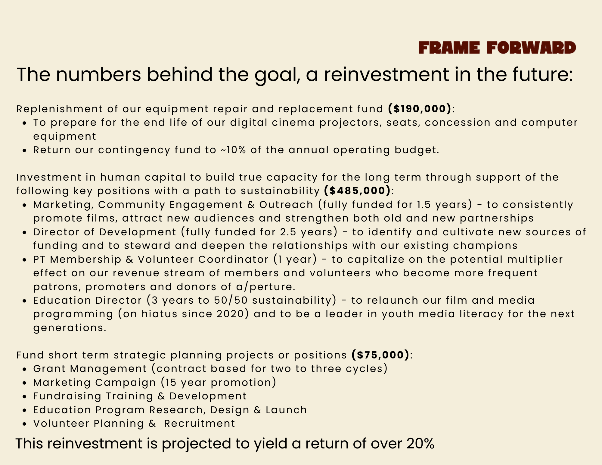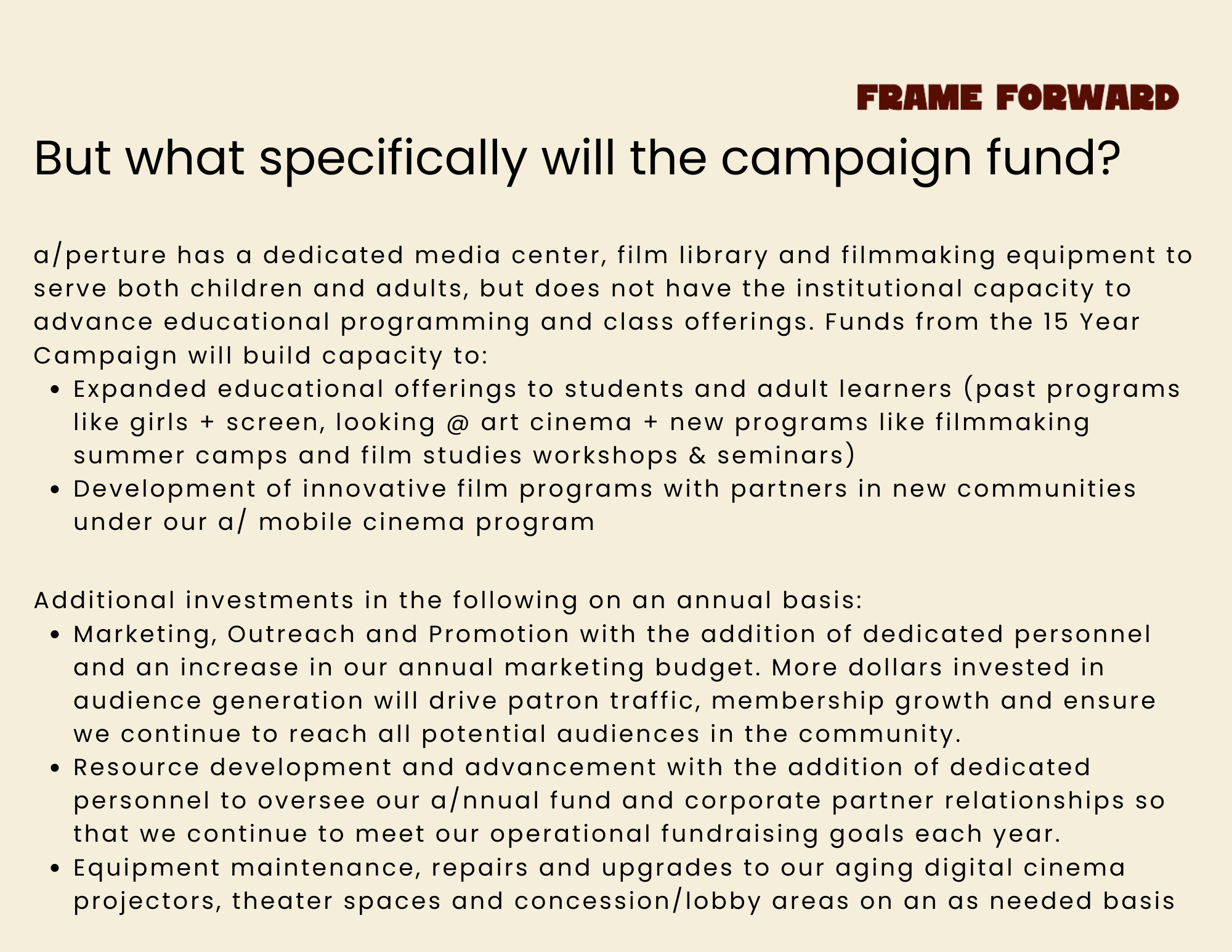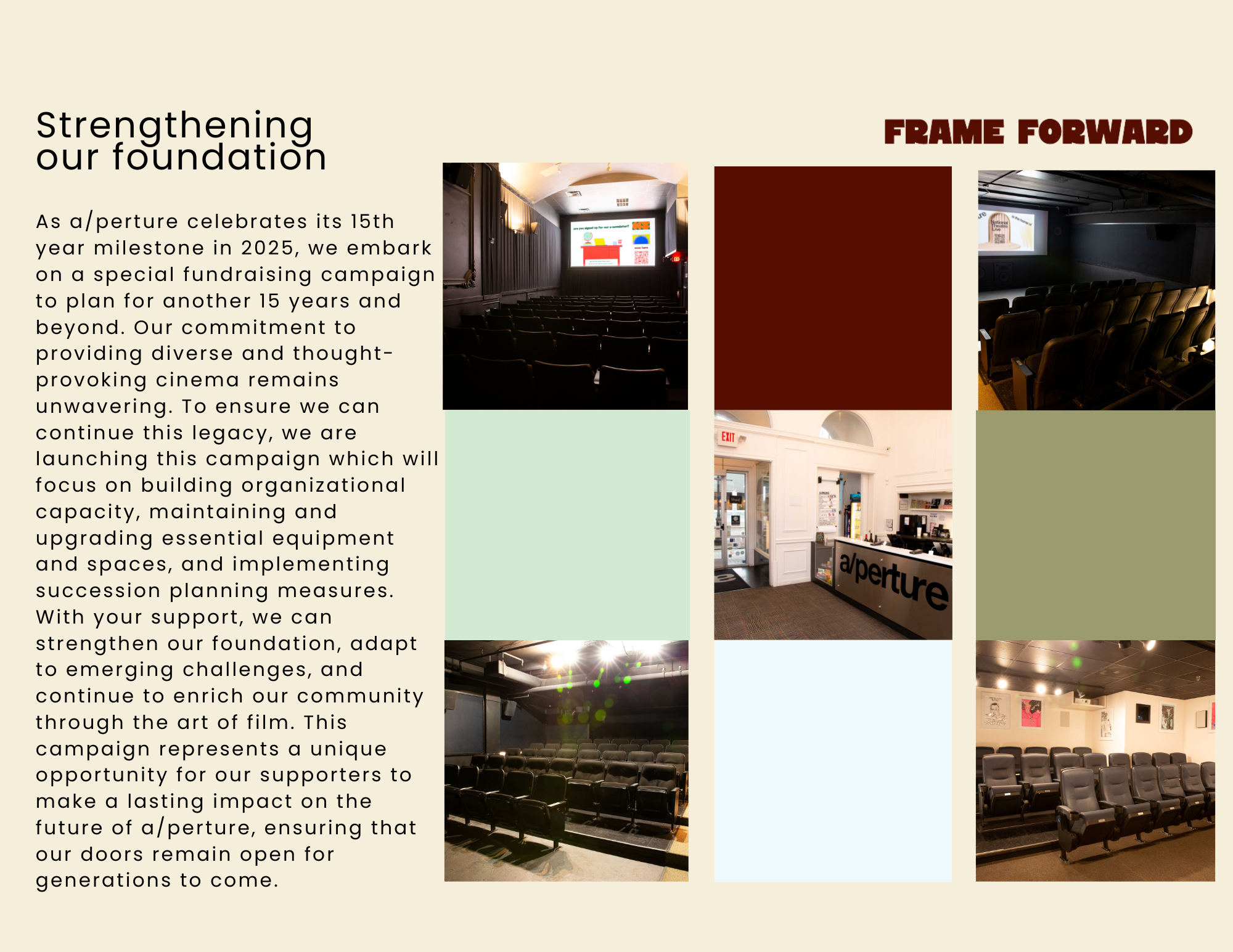 In order to sustain our commitment to excellence in film programming and to maintain our role as a catalyst for community engagement through the arts, a/perture must commit to allocating more resources to our annual operating budget. Historically, our budget has been smaller than that of U.S. art house cinemas we consider our peers as well as other local and regional arts institutions. To bridge this gap, we will increase our annual giving as well as actively seek public, foundation, corporate, and arts-specific operational and capacity building funding.