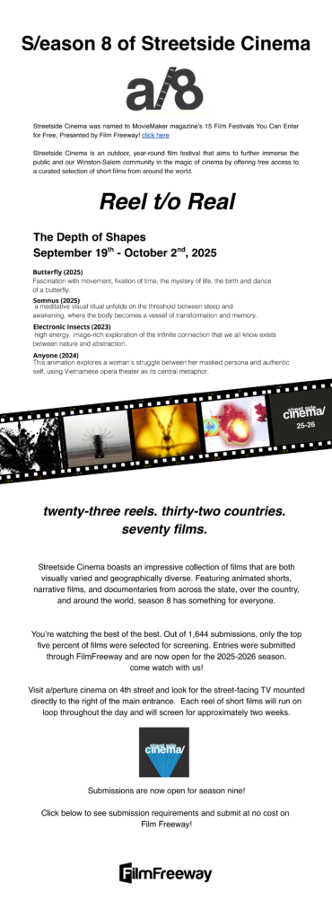 Streetside Cinema is an outdoor, year-round film festival that aims to further immerse the public and our Winston-Salem community in the magic of cinema by offering free access to a curated selection of short films from around the world.